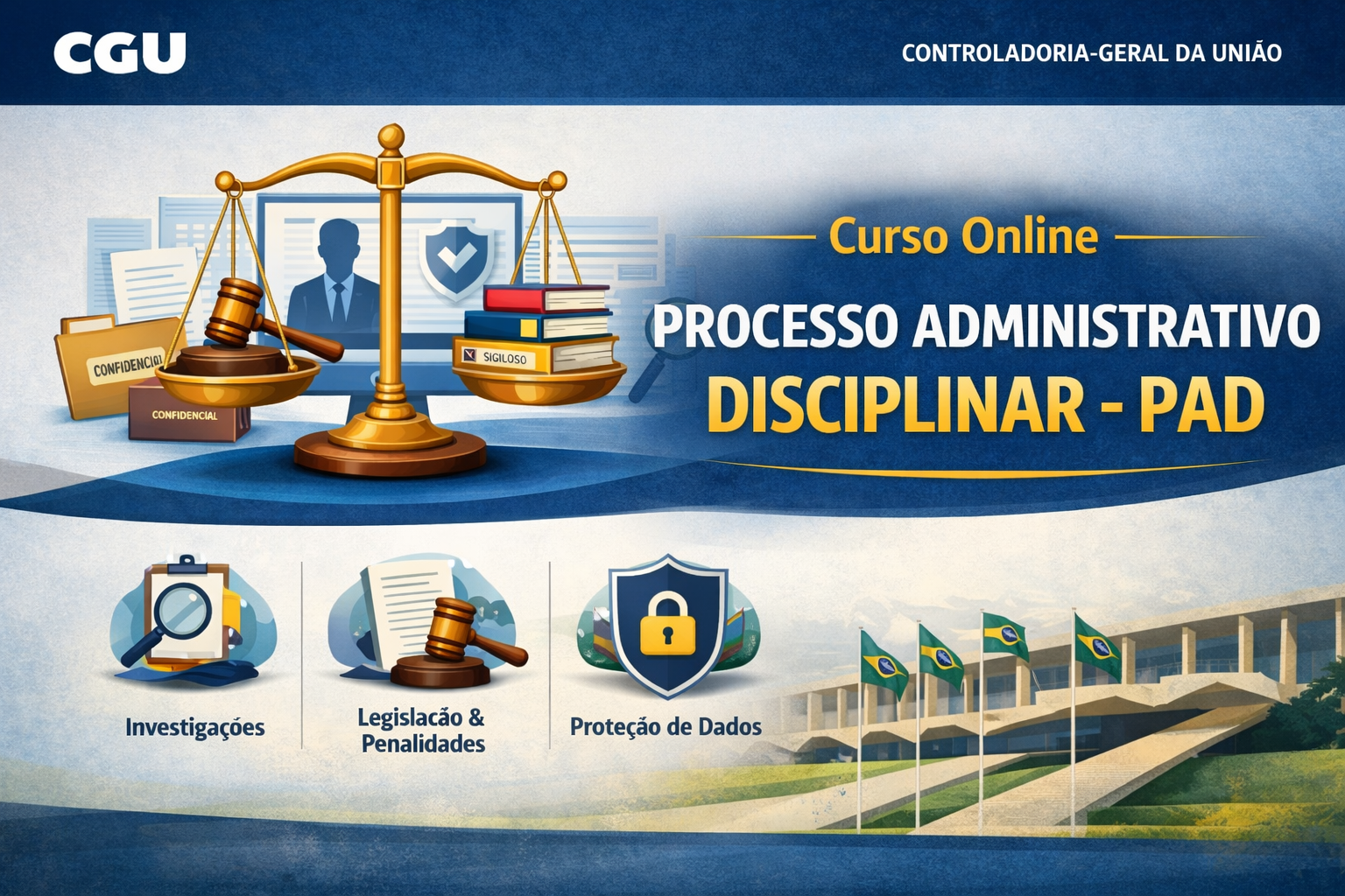 O curso Processo Administrativo Disciplinar (PAD), da CGU, busca fortalecer a atuação correcional no Poder Executivo Federal, com enfoque prático e segurança jurídica. Aborda o Sistema de Correição, fundamentos do Direito Disciplinar, dever de apurar e responsabilidade disciplinar. Examina procedimentos investigativos e acusatórios (investigação preliminar e sindicâncias) e detalha o PAD: fases, comunicações, enquadramentos, penalidades, dosimetria e relatório final, incluindo rito sumário. Trata ainda de prescrição, nulidades e proteção de dados (LAI e LGPD).
